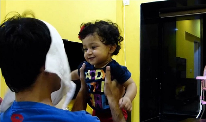 मुंबई, भारत में, एक आदमी दाढ़ी shaves, और वीडियो पर रिकॉर्ड पहली बार के लिए छोटी बेटी की प्रतिक्रिया नहीं दाढ़ी देखता है.