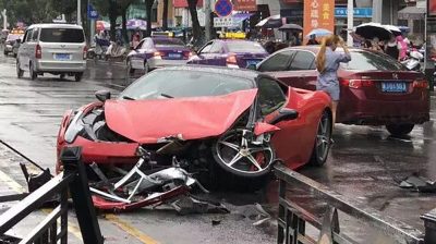 चीन में वेनलिंग शहर, एक औरत एक फेरारी 458 मूल्य 560 प्रमुख के रूप में टकराने.000कुछ ही मिनटों के बाद यह € किराए पर दिया गया. दुर्घटना से पहले, एक क्लिप है कि वह ड्राइवर की सीट से सामाजिक नेटवर्क पर पोस्ट, कथित तौर पर कार की खुशी से पता चलता. औरत गीला सड़क पर नियंत्रण खो दिया और आनेवाला कारों से टकरा.