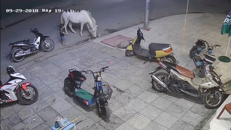शनिवार सैम बेटा वियतनाम में एक सड़क पर रात, एक छोटे लड़के परेशान करने के लिए एक घोड़े का दरवाजा खटखटाया. पशु तुरंत हवा में एक किक फेंकने से परेशान से पता चला, लेकिन बच्चे जोर दिया और एक किक कि एक खड़ी मोटरसाइकिल में फेंक दिया प्राप्त.