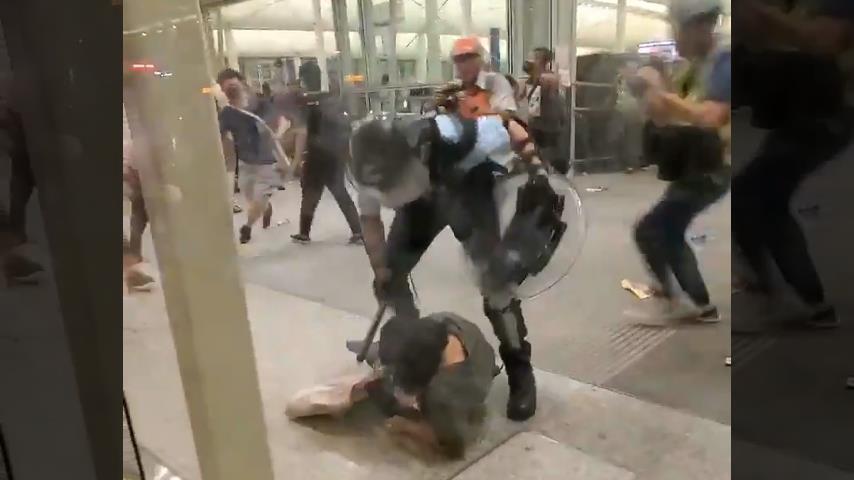 हांगकांग हवाई अड्डे पर पुलिस और प्रदर्शनकारियों के बीच संघर्ष के दौरान, एक पुलिसकर्मी कई प्रदर्शनकारियों ने हमला किया था जब वह भूमि पर एक औरत फेंक दिया. फिर वह उसकी बंदूक ले लिया और प्रदर्शनकारियों चिह्नित, जो अंततः हटाया.