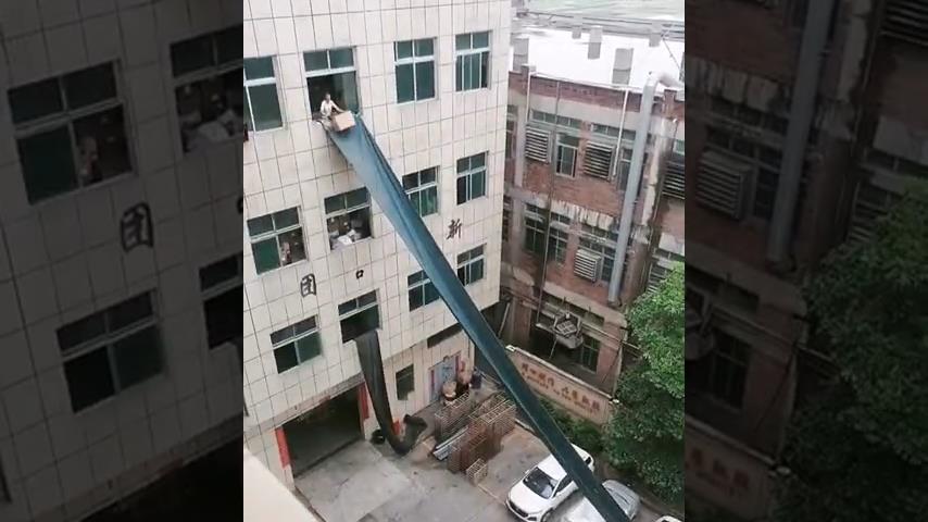 श्रमिक एक इमारत और एक ट्रक की तीसरी मंजिल पर एक खिड़की के बीच फैले लंबे तिरपाल का उपयोग करते हैं, वाहन में बक्से लोड करने के लिए. तेज और कुशल.