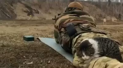 एक बिल्ली अपने मालिक के पैरों पर पड़ी है, जो एक शूटिंग रेंज पर निशाने लगाता है. ऐसा लगता है कि वह इस गतिविधि के आदी हो गए हैं.