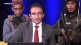 Taliban foot soldiers watching over the host of the Afghan TV show "Pardaz"