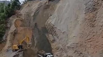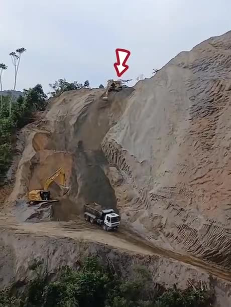 खुदाई करने वाला यंत्र ढलान पर फिसल रहा है