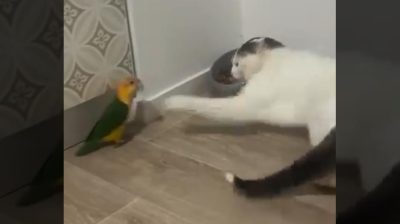 एक तोता को जबरन अपने भोजन से एक बिल्ली संचालित किया जाता है, इसे स्वयं खाने के लिए.