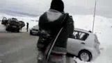 एक आदमी अपने बीएमडब्ल्यू X5 के साथ तेजी लाना चाहता था और बहाव में एक प्रदर्शन करना चाहता था. भारी कार ने अंकुश लगाया और अपने पीछे के दाहिने पहिये को तोड़ दिया.