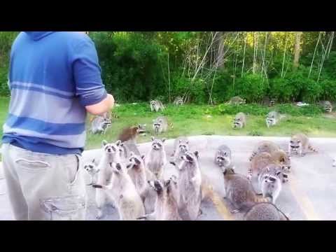 Raccoons crisps प्यार का एक झुंड, अचानक जंगल से बाहर प्रकट होता है.