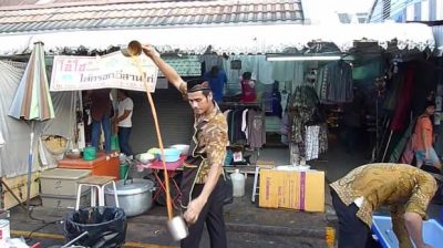 बैंकॉक में थाईलैंड का सबसे बड़ा बाजार में, Chatuchak, एक विक्रेता एक मूल रास्ते में ठंडी चाय तैयार करता है. मलेशिया में, इस तकनीक तेह Tarik कहा जाता है.