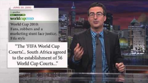 टीवी प्रस्तोता जॉन ओलिवर आगामी विश्व कप में ब्राजील की समस्याओं के बारे में वार्ता, और फीफा के भ्रष्टाचार.