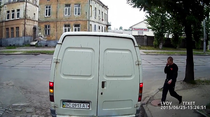 यूक्रेन में एक आदमी लापरवाही से अपने सेल फोन पर बात करता हुआ चला जा रहा है...