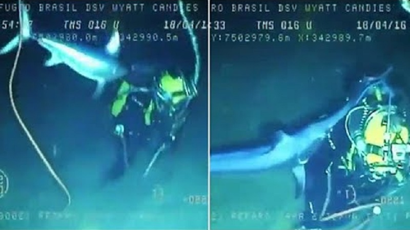 भयानक पल एक स्वोर्डफ़िश गोताखोर हमलों, एक गहरे समुद्र में ब्राजील के तट बंद. स्वोर्डफ़िश गोताखोर की ऑक्सीजन उपकरणों पर चोंच pierces और शरीर के कुछ इंच से बचा जाता है.