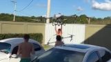 Gerani के गांव में एक महिला, क्रेते आगे एक स्कूटर डाल करने के लिए कोशिश कर रहा है, स्टैंड का उपयोग कर. एक और महिला तो मदद करने के लिए आता है, लेकिन प्रयास व्यर्थ है.