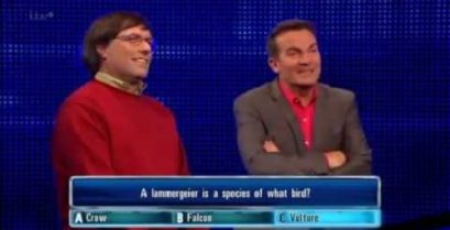 ब्रिटिश गेम शो ज्ञान 'पीछा' से अंश, जहां एक सवाल के बाद वन्यजीव शोधकर्ता रास वर्णन करता है कि क्या Lammergeier है lammergeyer. प्रस्तुतकर्ता ब्राडली वाल्श हँसी में मर.
