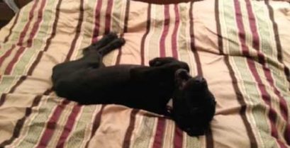 एक नींद पिल्ला नस्ल ग्रेट डेन कराहना और बिस्तर से पाने के लिए मना कर दिया, अपने मालिक के प्रयासों के बावजूद.