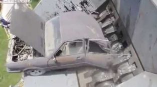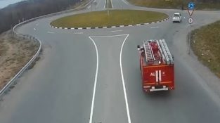 एक फायर ट्रक कि एक आग करने के लिए भागने, व्लादिवोस्तोक रूस के पास एक राउंडअबाउट के पास आता है. ट्रक के चालक घास के माध्यम से कटौती करने का फैसला.