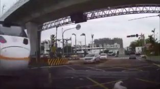 चीन में एक ट्रेन पार स्तर की बाधाओं पर एक गलती, मैं लगभग एक गंभीर दुर्घटना का कारण. सलाखों के एक सुपर फास्ट ट्रेन गुजर से पहले उठ खड़ा हुआ, लेकिन दो motorists पार पार एक चमत्कार से बख्शा गया.