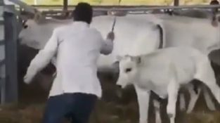 एक खलिहान में, एक आदमी को एक छड़ी के साथ उन्हें मारने से गायों को प्रत्यक्ष करने की कोशिश करता है, लेकिन एक युवा बछड़ा उसे बल के साथ लात होगा.