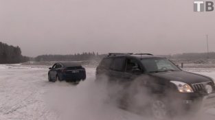 एक बिजली के टेस्ला मॉडल एक्स और बर्फीले सड़क में एक एसयूवी टोयोटा लैंड क्रूजर के बीच युद्ध की एक tug.