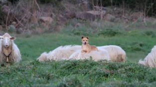 Fordongianus, सार्डिनिया, इटली के गांव में, एक कुत्ता एक भेड़ पर आराम से और सवारी करना पड़े.