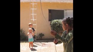 तीन युवा बच्चों एक सीढ़ी के साथ एक जोखिम भरा प्रयोग की कोशिश करेंगे, पिछवाड़े में.