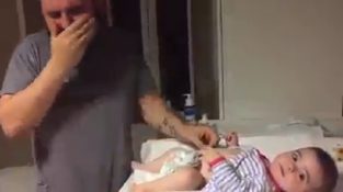 एक पिता की प्रतिक्रिया है जो पहली बार के लिए बच्चे पर डायपर बदलने का प्रयास करता. बच्चा भी हँसने लगा...