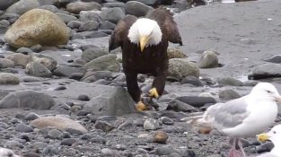 अजीब अलास्का समुद्र तट में Kenai प्रायद्वीप पर एक whiteheads ईगल घूमना, एक आदमी की याद ताजा करती उतारा पतलून के साथ चल रहा.