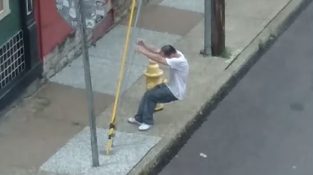 शायद ड्रग्स के प्रभाव में एक आदमी, रस्सी एक बिजली पोल समर्थन खींचती, संयुक्त राज्य अमेरिका में सिनसिनाटी में एक सड़क का में. फिर वह द्वारा एक रेस्तरां और फुटपाथ पर लौटने के द्वार पर चला जाता है [...]