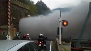 जेनोआ, इटली में, वाहनों एक लोकोमोटिव के सामने से गुजर रहा से पहले एक रेलवे क्रॉसिंग पर रोक, एक सुरंग से बाहर आ रहा. लेकिन धुआं सुरंग से बाहर आने के ड्राइवरों की दृश्यता पाएगा, [...]