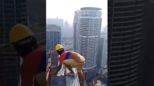 श्रमिक रिकॉर्ड वीडियो वे कुआलालंपुर में एक गगनचुंबी इमारत की चोटी पर मचान जगह के रूप में, मलेशिया की राजधानी. 400 मीटर की ऊंचाई पर काम कर रहे पुरुषों, बेल्ट या किसी सुरक्षा उपाय के बिना.