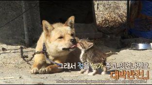 कुत्ता एक बिल्ली का बच्चा स्तनपान