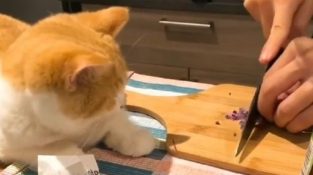 एक बिल्ली प्याज कि मालिक कटौती की रोता है,, जबकि आराम से रसोई काउंटर पर बैठे.