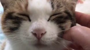 एक औरत की उसे बिल्ली सिर सहलाने. लेकिन अचानक, बिल्ली बिस्तर पर गिर, तरह सम्मोहित. शायद बैटरी से बाहर भाग.