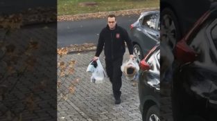 एक आदमी अपने छोटे बेटे के साथ घर पर खरीदारी रिटर्न, कि हठ जमीन पर पड़ा होने लगता है.