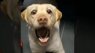 एक लैब्राडोर की हास्यास्पद overexertion हवा में एक बिस्कुट को पकड़ने के लिए.