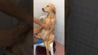 एक कुर्सी पर बैठे, एक कुत्ते को विशेष रूप से मालिक से एक शॉवर का आनंद लेने के लिए लगता है.