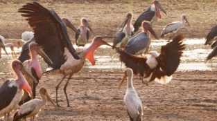 अपने भोजन के साथ खेल एक Marabou सारस अपने समय लगता है जब, एक ईगल में स्वूप यह चोरी करने के लिए.