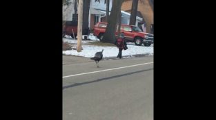 एक टर्की एक छोटे लड़के एक सड़क पर चल रहे पीछा करता है.