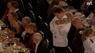 दोपहर के भोजन के दौरान 10 वीं दिसंबर स्टॉकहोम में नोबेल पुरस्कार के देने के बाद पर, एक वेटर गलती स्वीडिश शैक्षिक दान Larhammar की जैकेट में भोजन फेंक.
