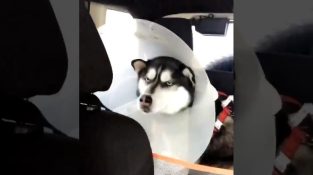 टेक्सास में एक कर्कश का गुस्सा देखो, एक बड़े गर्दन कॉलर के साथ पशु चिकित्सक से रिटर्न के रूप में.