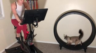 एक औरत एक व्यायाम बाइक कर, बिल्ली एक पहिया पर चलता है, जबकि. अचानक, बिल्ली बंद हो जाता है और कालीन पर उल्टी. मुझे लगता है कि यह एक ब्रेक लेने का समय आ गया है.