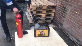 एक आदमी बियर की एक टोकरा फ्रीज करने के लिए एक आग बुझाने का उपयोग करता है.