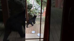 उत्तर Krolina संयुक्त राज्य अमेरिका में एक घर में, एक भालू कुत्ते के भोजन के साथ छोटे और चोरी कटोरा के साथ छत के करीब पहुंच गया है.