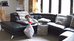 एक कुत्ता सोफे के खेलों में से एक खेलना चाहता है, लेकिन इस मंजिल पर गिर जाएगी. तब गुस्सैल कुत्ता overreacts और कराहना शुरू होता है.