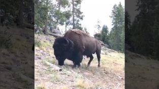 संयुक्त राज्य अमेरिका में येलोस्टोन नेशनल पार्क में 2019 की 22 जुलाई को, एक छोटे से एक विशाल जंगली भैंसों द्वारा हवा में शुरू की महिला. महिला गंभीर रूप से घायल हो गया था.