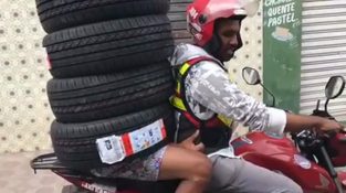 दो आदमी एक प्रभावी तरीका सोचा आसानी से अपने मोटर साइकिल के साथ चार टायर ले जाने के लिए. पहले सुराग, दूसरा शरीर के चारों ओर रखकर टायर हस्तांतरण करने के लिए ले जाता है, जबकि.