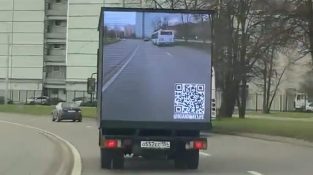 मास्को में, सड़क पर एक ट्रक के पीछे एक बड़ी स्क्रीन होती है जो दिखाती है कि ड्राइवर क्या देखता है.