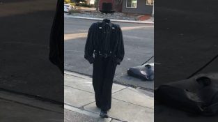 लिवरमोर, कैलिफ़ोर्निया में हैलोवीन के लिए, एक 9 साल का बच्चा अदृश्य आदमी में बदलने के लिए अपने पिता के कपड़े और एक चतुर प्रभाव का उपयोग करता है.