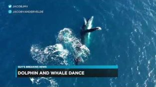 फ़ोटोग्राफ़र जैकब वेंडरवेल्डे एक शानदार ड्रोन दृश्य को कैप्चर करने में कामयाब रहे. हम देखते हैं कि एक डॉल्फ़िन एक हंपबैक व्हेल के चारों ओर घूमती है जो खुद पर घूमती है, शानदार कोरियोग्राफी कर रहे हैं.