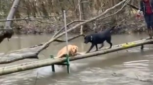 अपने दोस्त को संकरे पुल से पानी में गिरने के खतरे में देखकर, एक कुत्ता उसकी मदद के लिए दौड़ता है. विशेष रूप से चलती दृश्य.