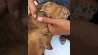एक छोटा मुर्गी कुत्ते के बालों से पिस्सू हटाता है.